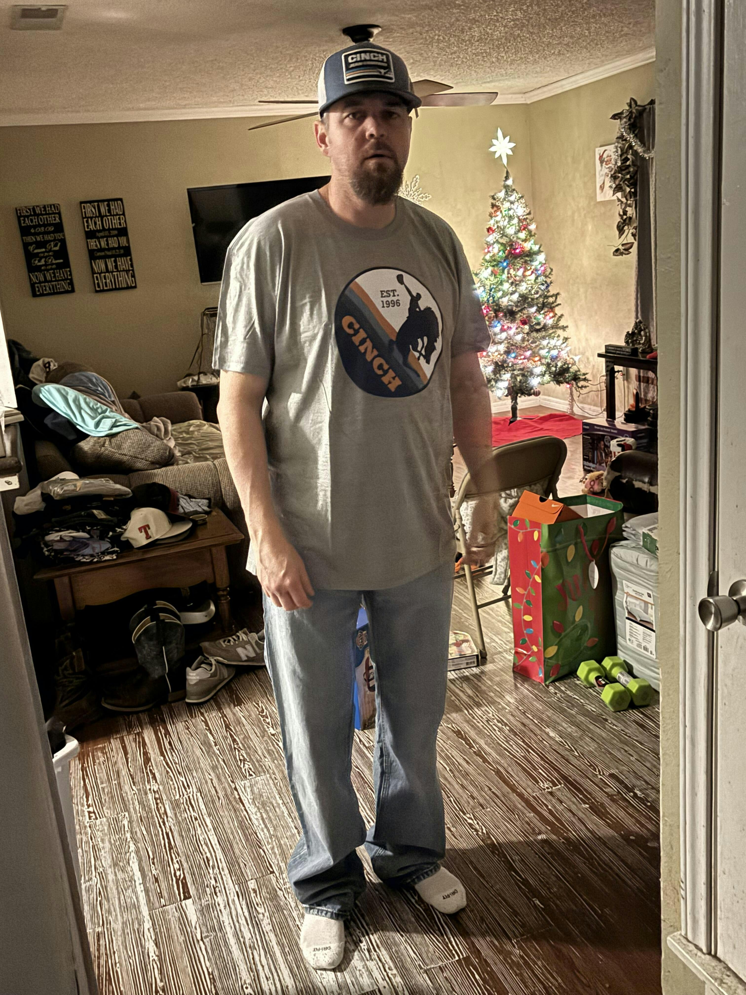Kick up dust on the trail or in the arena wearing this gray cotton-poly crew neck tee shirt crafted by CINCH. Featuring a bucking bronc front screen print, this comfortable tee paired with blue jeans is every cowboy's new favorite.