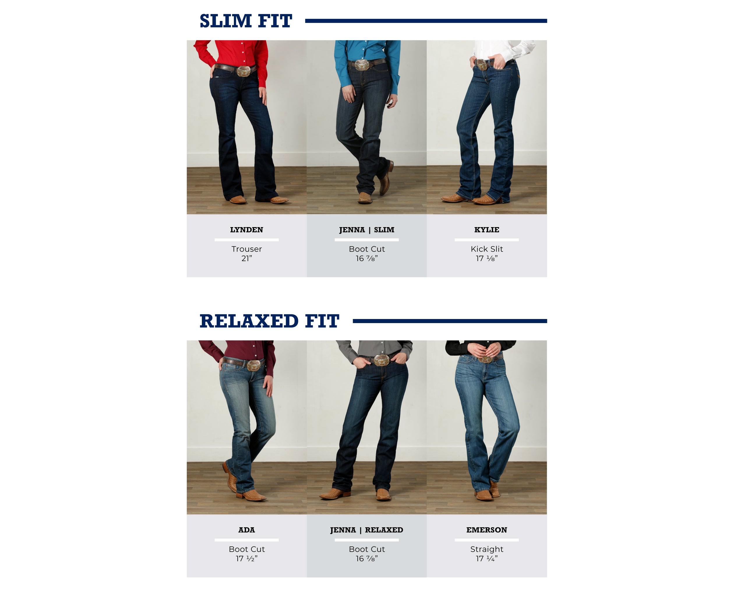 Cinch women's jeans combine classic western styling with performance ready construction. Our jeans are offered in slim and relaxed fits. For a slim thigh and leg, try the Jenna or Kylie jean. For a relaxed thigh and leg, try the Ada or Jenna jean.